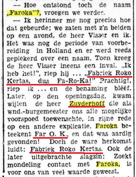 “Saya masih ingat persis kejadiannya, kami berdua sedang duduk bersama suatu malam, tuan G. Visser (direktur Faroka) dan saya. Saat itu masih masa persiapan di Belanda, dan kami sedang memikirkan sebuah nama.” Lalu tuan Visser tiba-tiba mendapat ide.” “Saya dapat!” teriaknya… “Fabriek Roko Kertas“, disingkat jadi “Fa-Ro-Ka!” “Hebat!” seru saya… dan nama “Faroka” itu kemudian ditetapkan.