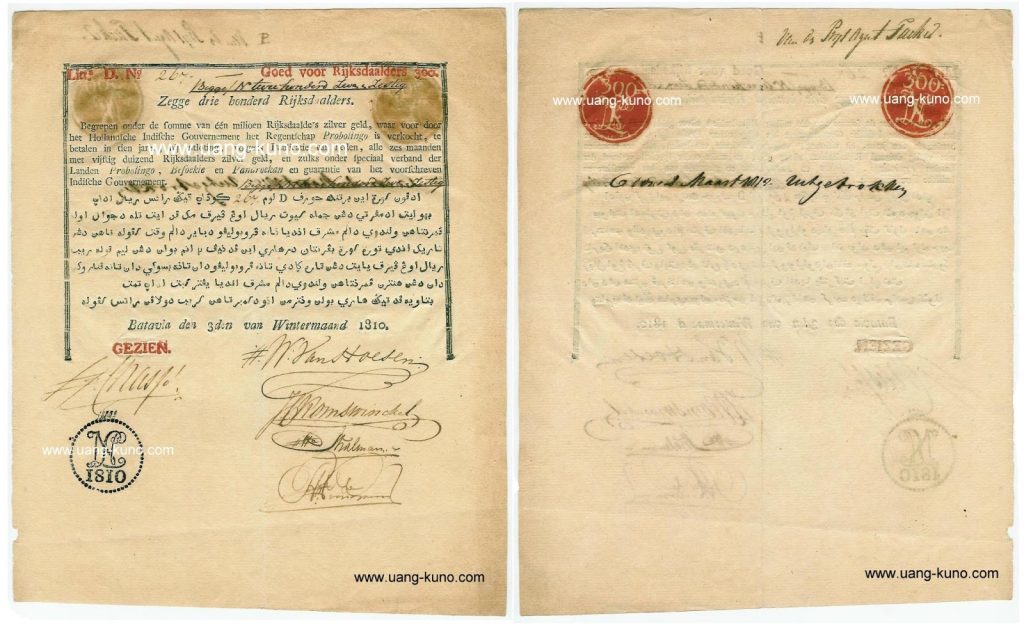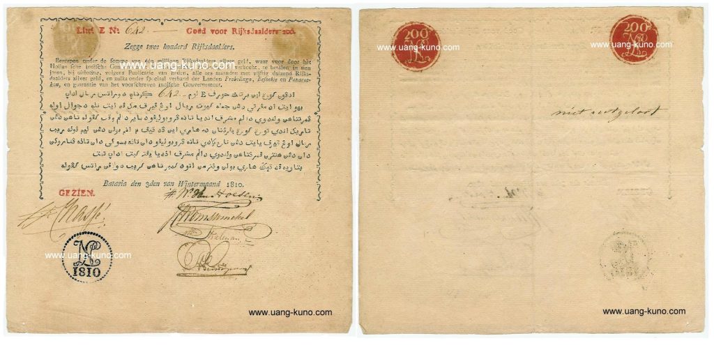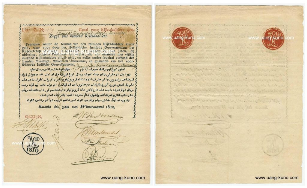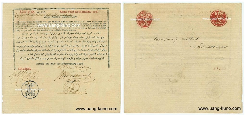Jadi surat kredit ini terdiri dari 6 (enam) pecahan yaitu 100 (seri F), 200 (seri E), 300 (seri D), 400 (seri C), 500 (seri B) dan 1000 (seri A) Rijksdaalders, di stempel dengan huruf “LN” dan tahun 1810, “LN” singkatan dari “Louis Napoleon”, karena masa itu Belanda sedang dikuasai oleh Perancis, dan ditandatangani 5 orang saksi atau pejabat.