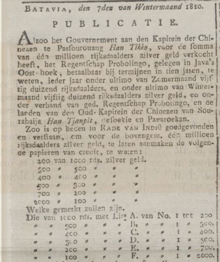 Penjualan tanah di kabupaten Probolinggo ini, dipublikasikan di “Bataviasche Koloniale Courant”, edisi 07-12-1810. Dengan perincian surat kredit yang diterbitkan sebagai berikut :