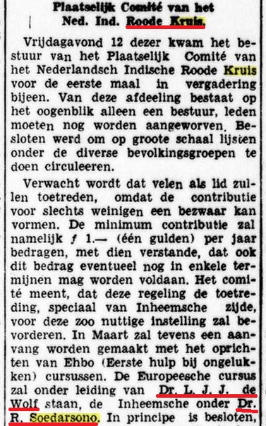 Organisasi Palang Merah daerah Pasuruan dibentuk tanggal 12 Februari 1937, oleh para dokter di Pasuruan. Pelatihan P3K untuk orang Eropa dilakukan oleh “Dr. L. J. J. de Wolf”. Sedangkan untuk warga pribumi oleh “Dr. Soedarsono” (Soerabaijasch Handelsblad, edisi 15-02-1937).