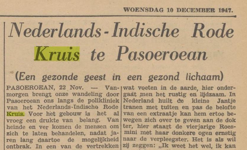 Sebuah reportase tahun 1947, harian Eindhovensch Dagblad, edisi 10-12-1947, melaporkan aktivitas organisasi Palang Merah di Pasuruan, dapat disimak dibawah ini :