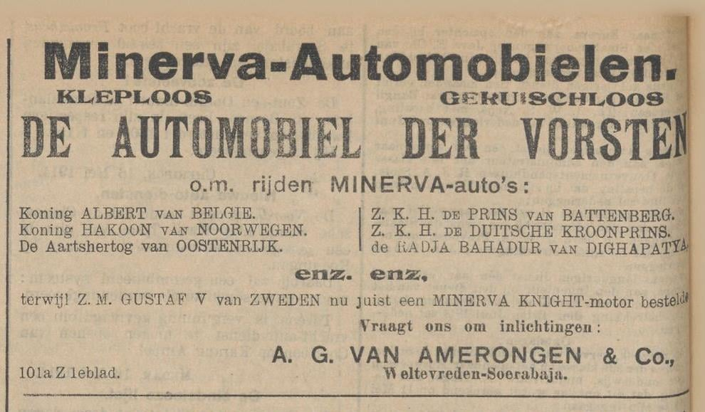 Menggunakan mobil merk “Minerva” yang terkenal, yang diimport oleh perusahaan “Van Amerongen”, yaitu model Minerva 1913 yang sudah dilengkapi dengan perangkat terbaru. Minerva merupakan mobil mewah buatan Belgia yang sekelas dengan Rolls-Royce, tapi dengan harga yang lebih murah. Pabriknya didirikan tahun 1883 oleh pemuda Belanda, Sylvain de Jong, yang memulai produksinya dengan pembuatan sepeda dan sepeda motor. Diantara pelanggannya adalah Raja Albert dari Belgia, Raja Hakoon dari Norwegia, Putra Mahkota Jerman, Raja Bahadur dari Dighapaty, dll. Minerva sangat terkenal hingga disebut “The Goddess of Automobiles” atau “Sang Dewa Mobil”.