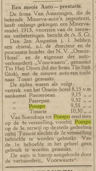 Sebuah rekor kecepatan mobil untuk perjalanan dari Surabaya ke Tosari, dicatat pada tanggal 2 Agustus 1913. Dilakukan oleh tiga orang dari Surabaya : 2 (dua) orang dari “Hotel Oranye” (Direktur dan Manager hotel), serta seorang pemilik perusahaan rental mobil “Voorwaarts” (yang artinya : Maju), bernama “Tio Haij Djoen” (anggota perusahaan Tio Siek Giok).