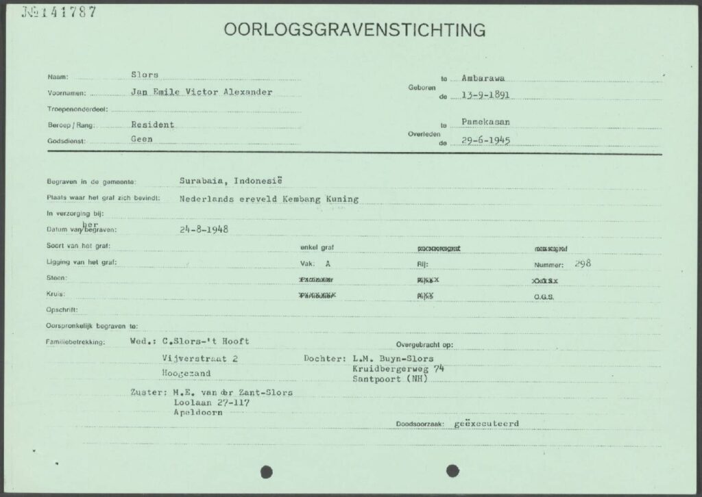 Jenazah Residen Slors dimakamkam kembali pada tanggal 24 Agustus 1948 di Ereveld Kembang Kuning. Surat kabar Nieuwe Courant, edisi 24-08-1948 menuliskan sebagai berikut :