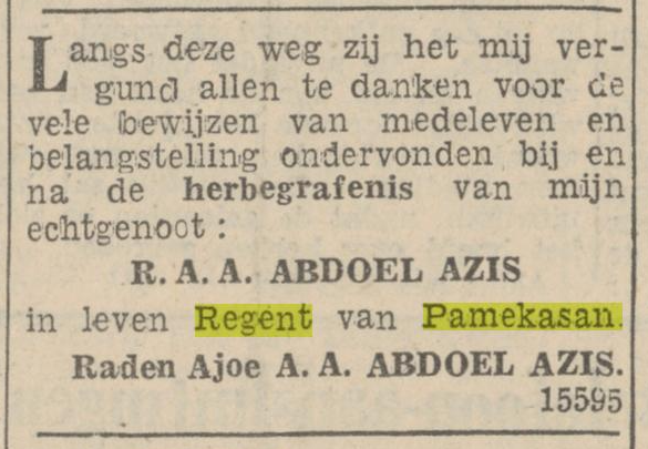 Ucapan terima kasih dari keluarga Bupati R. A. A. Abdoel Aziz.