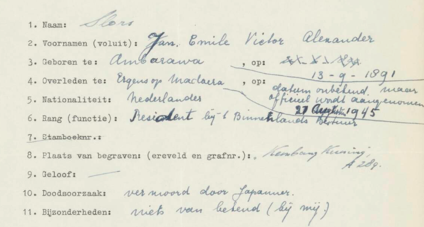 Residen Slors Dibunuh oleh Kem Pei Tai Setelah Kapitulasi Jepang. Kepala Cabang Surabaya dari Dinas Investigasi Korban Perang (ODO), tuan J. W. F. Meeng, melaporkan hal berikut dari Pamekasan: Dari interogasi yang dilakukan oleh sersan Kem Pei Tai Pamekasan yang terkenal kejam, Hashimoto—yang ditahan di penjara Cipinang di Batavia dan sementara itu dijatuhi hukuman mati—ditarik kesimpulan bahwa Residen Madura, V. Slors, meninggal sesaat sebelum kapitulasi Jepang; jenazahnya dilaporkan dimakamkan di pemakaman Eropa Pamekasan.