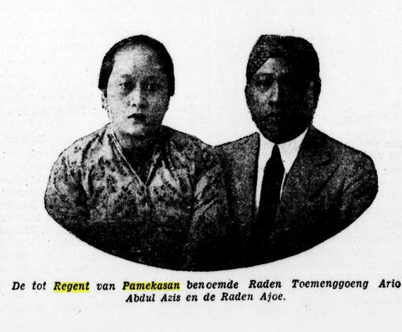 Bupati Pamekasan yang baru dilantik, Bapak R. T. A. Abdul Azis, lahir di Situbondo pada tanggal 11 Desember 1896, dan merupakan putra almarhum R. M. A. A. Koesoemodipoetro, yang saat itu menjadi Bupati Panarukan. Ia berhasil menyelesaikan Sekolah Dasar Eropa dan kemudian bersekolah di Sekolah Prins Hendrik di Batavia. Setelah menyelesaikan lembaga pendidikan ini pada bulan Mei 1917, ia diangkat menjadi asisten juru tulis untuk Wedono di distrik Wonosarie, Kabupaten Bondowoso pada tanggal 23 Mei 1917. Pada tanggal 14 Maret 1918, ia diangkat menjadi calon Pegawai Negeri Sipil di Dinas Administrasi Pribumi;